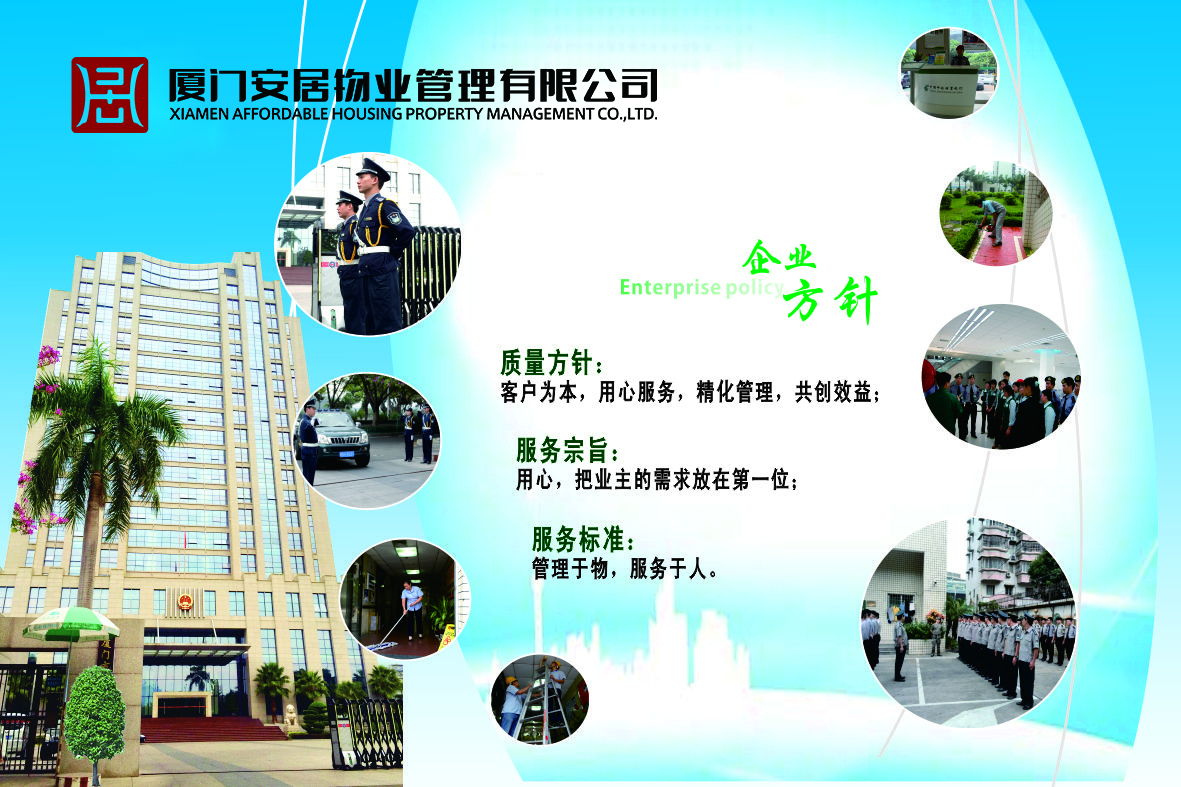 公司奉行务实、人本的企业作风,全面实施ISO9001质量管理体系和ISO14001环境管理体系,秉承“客户为本,用心服务;精化管理,共创效益”的质量方针,坚持“用心,把业主的需求放在第一位”的服务宗旨以及“管理于物,服务于人”的服务标准,全力为业主营造温馨舒适、安全文明、干净整洁的办公与生活环境。
